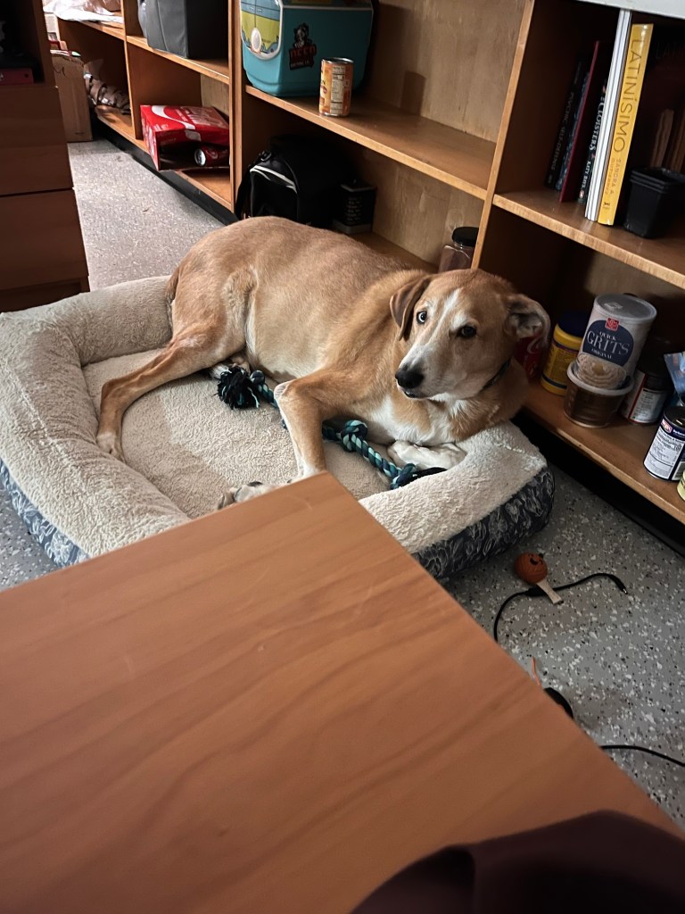 He had more behavioral issues, and is one of our more prissy dogs. He has terrible separation anxiety, and was a bit of a chewer in his early days. We adopted him as an adult, so he was a bit harder to train. However, he has fully relaxed and is a great family dog now!