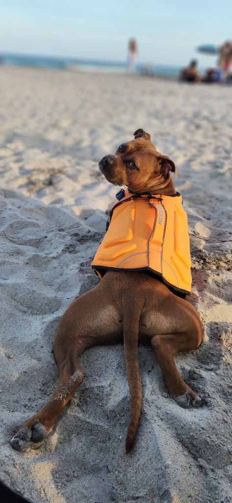 - Floating leash or waterproof gear: Keeps them safe in the water without restricting movement. I would also recommend a life vest if your pup is a swimmer or has a limb difference like Trace.